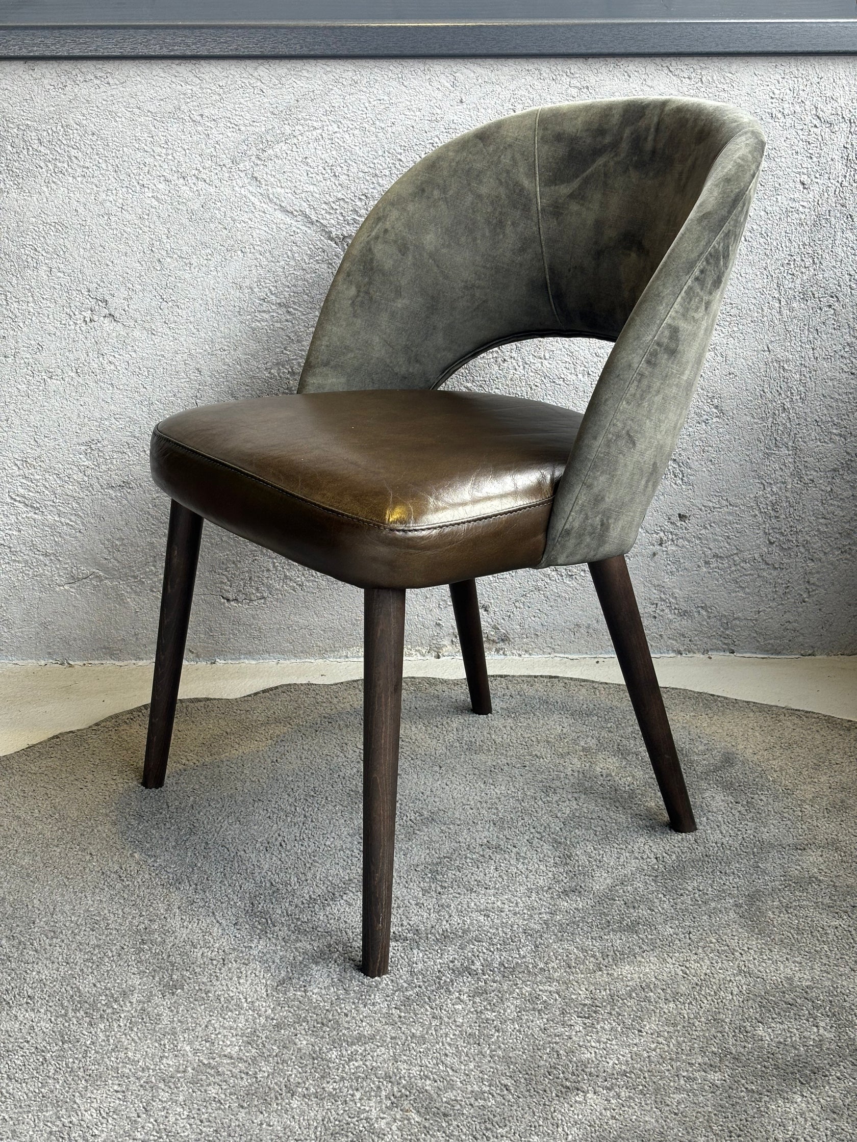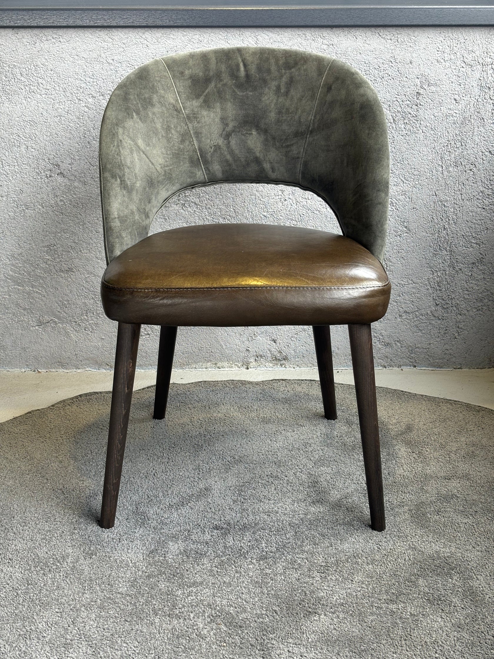 Scaunul Dex impresionează printr-un design sofisticat, potrivit pentru spații elegante, restaurante, birouri sau zone de dining. Construit pe o structură din lemn masiv de fag, acest model oferă stabilitate și durabilitate, fiind completat de o tapițerie deosebită: piele naturală de bivol pe șezut și catifea fină pe spătar.